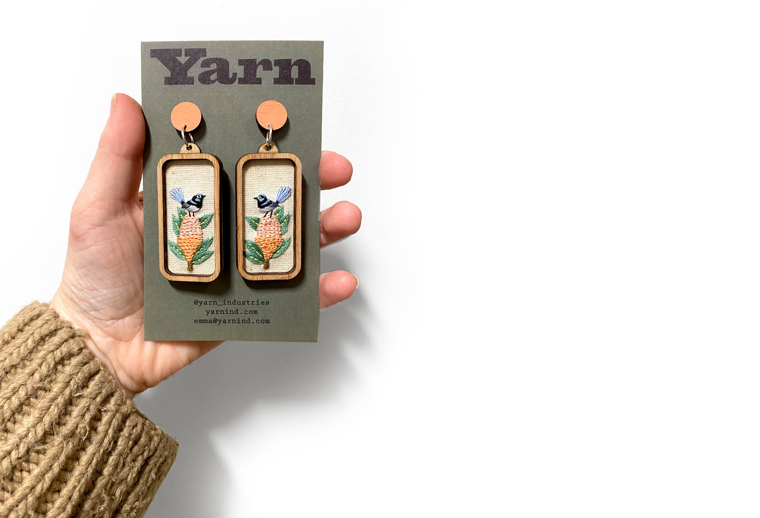 Hand embroidery of a pair of fairy wrens landing on a banksia. Stitched on natural cotton fabric created into rectangular wooden framed earrings.