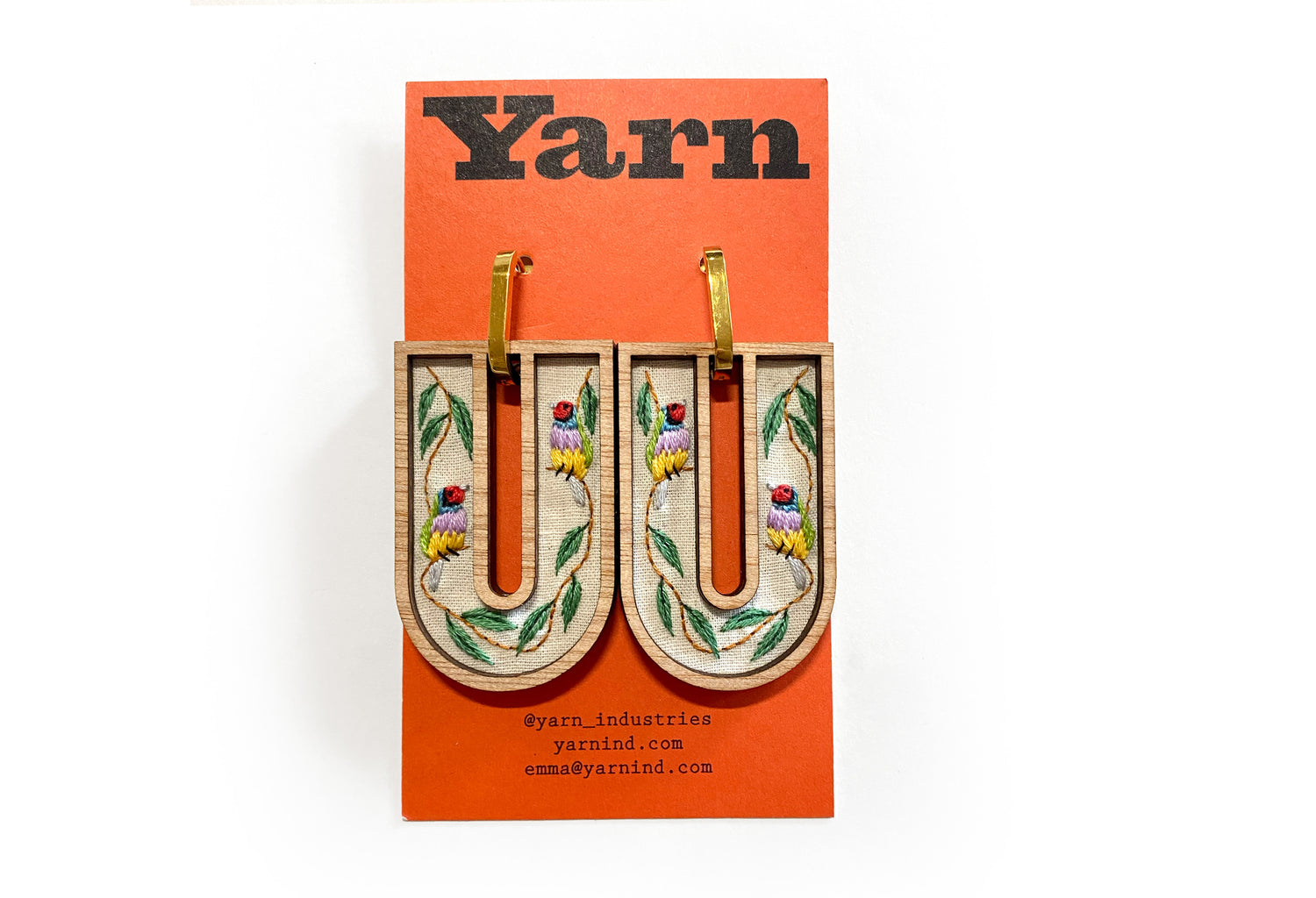 Celebrate the colour and character of Australia’s native wildlife with these hand embroidered Gouldian Finch earrings. Each pair captures a tiny scene of two vibrant finches perched among gum leaves with a joyful nod to our bushland’s beauty and song.